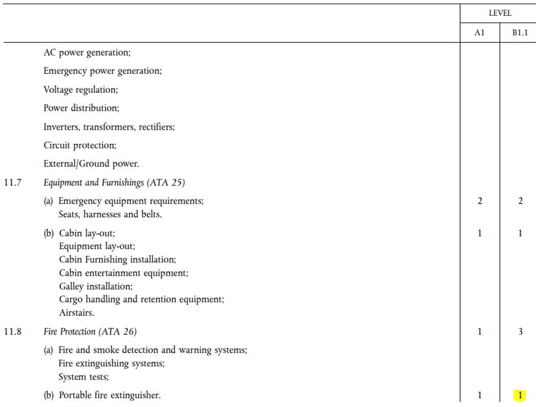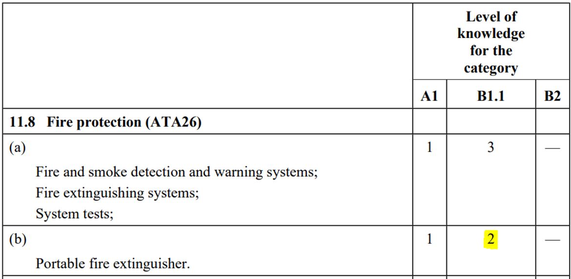 Different regulators may require assessment of equivalent topics, but at different levels. A common example of this for a B1.1 licence is topic 11.8(b) – Portable fire extinguishers. Under CASA, this is required to be assessed at knowledge level 2 (see below).
