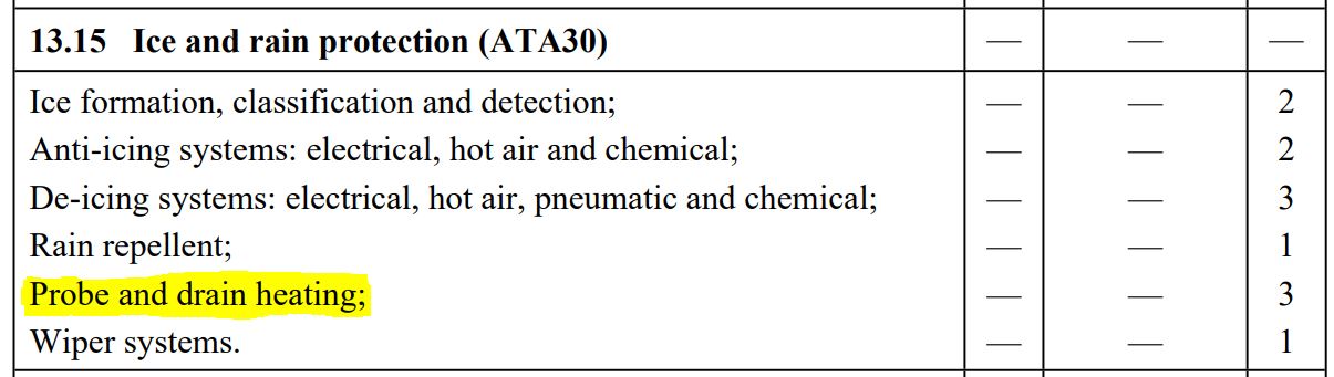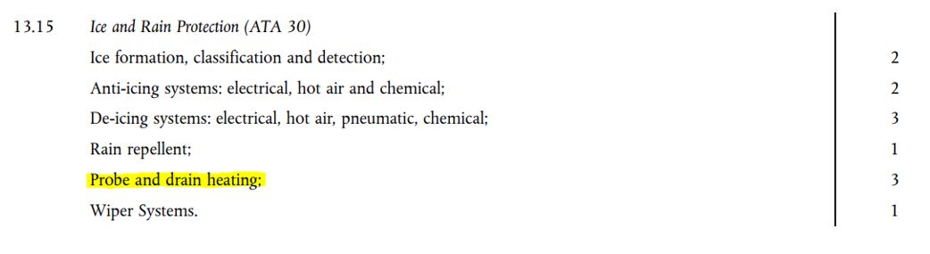 In some cases, entire topics have been removed from the part 66 syllabus. Shown below is the original version of commission regulation 1321/2014 (published 17/12/2014) showing the requirement of Topic 13.15.5 (Probe and drain heating).