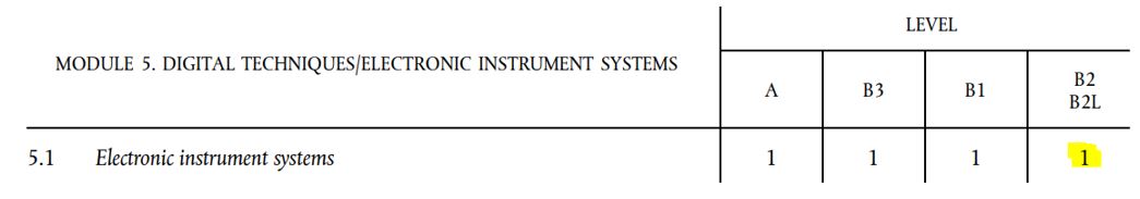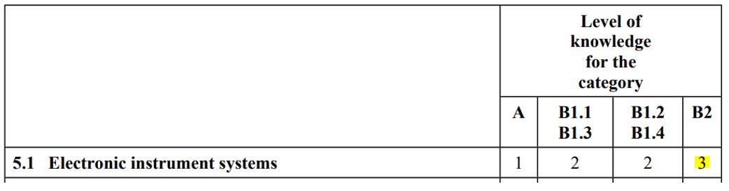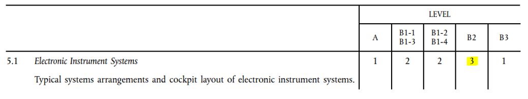 In some cases, the level requirements have changed, for example when EASA has released a new version of the EU commission regulation. This may result in changes to the knowledge level required. Compare the following two versions to the EU commission regulation 1321/2014. Below is the original version (published 17/12/2014) which requires Topic 5.1 (Electronic Instrument Systems) to be assessed at knowledge level 3 for a B2 licence outcome.